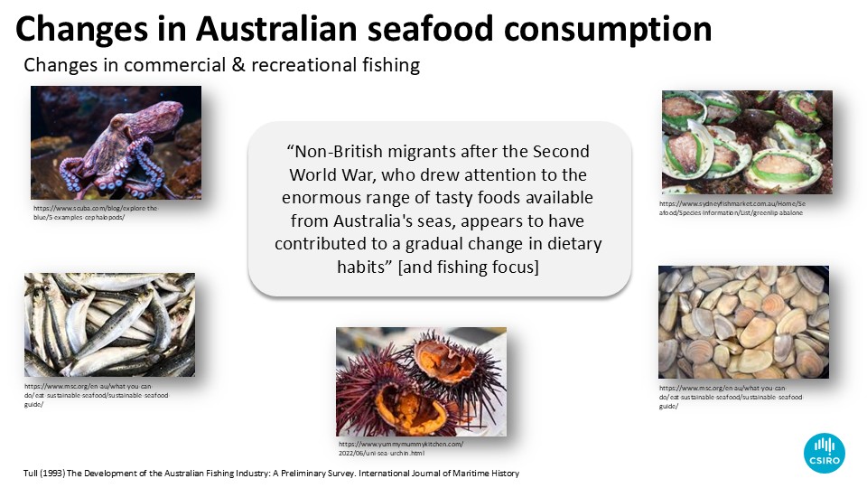 There is a bit of evidence that changing demographics changes fishing behaviour. In particular, that new waves of immigration to Australia in the past 100 years has brought with it new preferences for different fish. Italian and Greek migrants brought with them fishing knowledge and a love of cephalopods of all descriptions. At the time, squid, cuttlefish, and octopus were used by Australians as bait at best and fertiliser at worst. Modern Asian migrants have a fondness for tropical fish (Barramundi, Mangrove Jacks, and Spanish Mackerel) and molluscs. Familial connections were used to establish exports (benefitting the fishing industry). “Non-British migrants after the Second World War, who drew attention to the enormous range of tasty foods available from Australia’s seas, appears to have contributed to a gradual change in dietary habits” and fishing focus [from Tull (1993) The Development of the Australian Fishing Industry: A Preliminary Survey. International Journal of Maritime History]. The management implication are also evident (e.g. localised depletion, potential for conflict, health hazards, communication challenges).