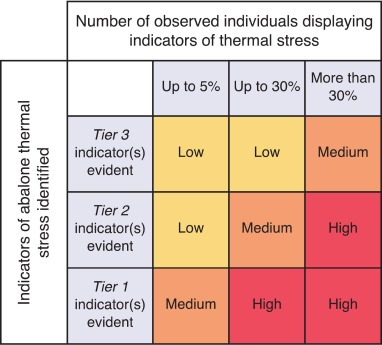 A simple matrix links the severity of biological stress indicators with the proportion of animals affected, triggering low, medium or high response levels. - Response actions