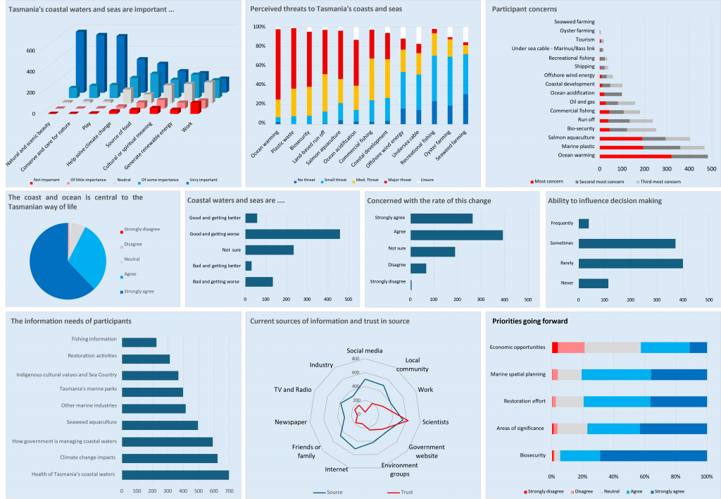 - Almost 70% of respondents were concerned not only about the health of Tasmania’s coastal waters and seas, but also the rate at which these environments were changing. They reported feeling worried or angry, and believed that they had minimal input and impact on government and industry decision making.