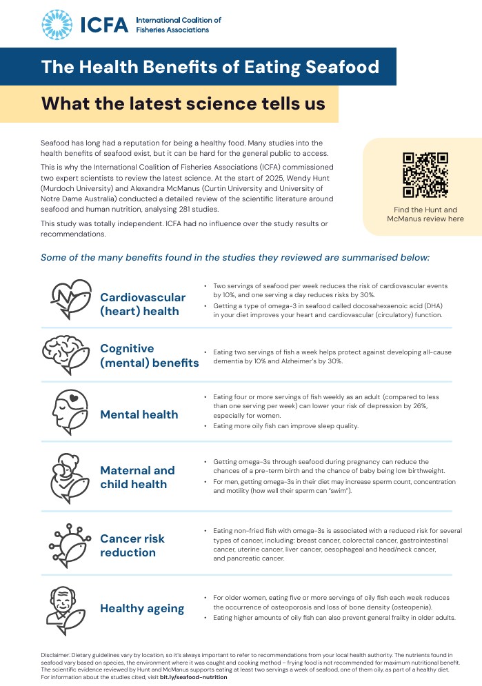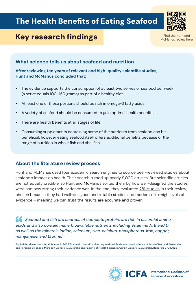 This report summarises a decade of peer-reviewed research (2015–2025), presenting moderate to high-level scientific evidence on the health benefits associated with seafood consumption. It offers a clear, evidence-based foundation for discussions about the importance of a sustainable and thriving seafood industry.